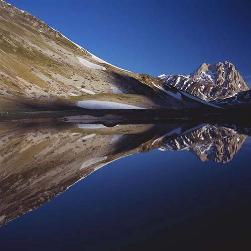 Piero Angelini si apposta, non visto, nei punti più segreti e attende che la montagna si addormenti o si svegli, o accolga nei suoi pianori gli animali, che con i loro campani ritmino la fatica degli uomini, per disgelarla con discrezione trasferendo vile proprie umanissime vibrazioni. Ma senza i filtri di una montagna banalizzata dalle cartoline dolomitiche. E qui sta la sfida. Il Gran Sasso esalta la magia dell’Appennino senza mai ripetere i gusti risaputi dei luoghi più famosi delle Alpi. Sentire l’Adriatico a pochi passi, o un umano vibrare di un medioevo tutto da scoprire dell’interno fatto di abbazie e basiliche e civiltà di opere e di mercati, è un po’ il segreto dei silenzi di queste fotografie, che non fanno il verso a nessun genere e che mai scadono nell’effetto facile, essendo viceversa di una francescana semplicità